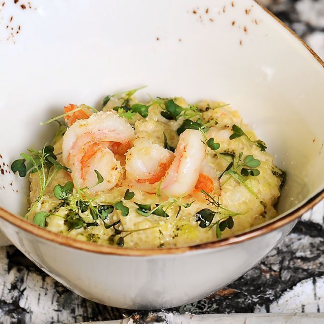 Каша пшенная на сливках с тигровыми креветками и пармезаном, 250 гр.