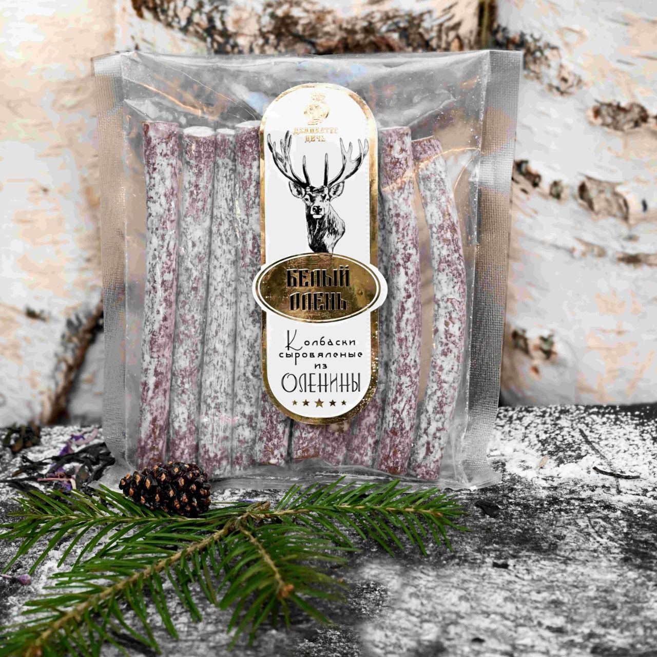 Мясо оленя, говядина, телятина, вода питьевая, соль пищевая, аскорбиновая кислота, специи, ароматы специй (перец черный, чеснок), стартовые культуры, нитрит натрия. |