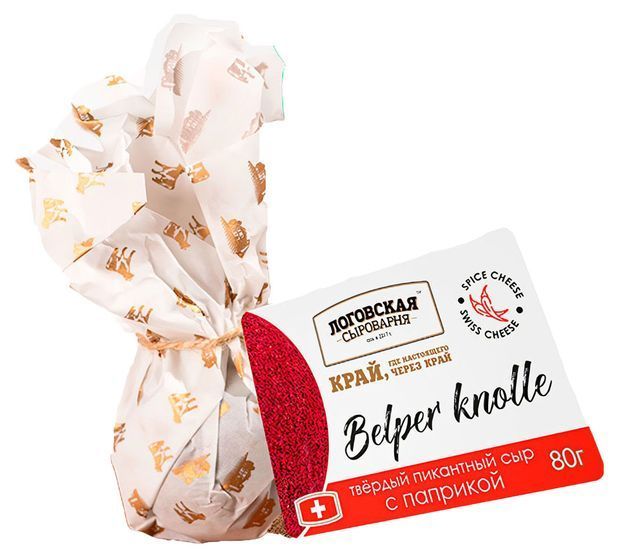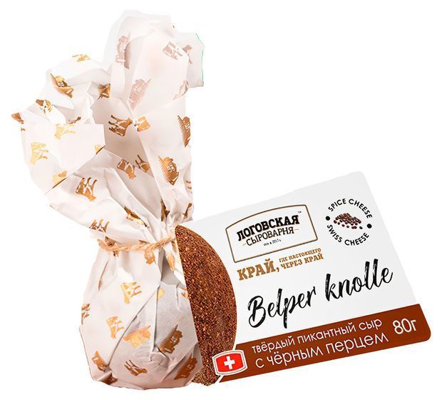 Твердый сыр «Белпер Кнолле» в обсыпке из черного перца либо копченой паприки упакован в пергаментную бумагу, имеет жирность 50% и вес 80гр.
