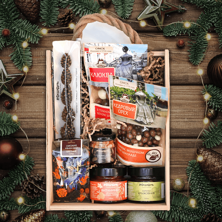 В стоимость набора входит деревянный бокс с крышкой #ФедяДичь. При желании можно дополнительно подобрать новогоднюю крышку либо крышку-картину омского художника Сергея Демиденко с пейзажами зимнего г.Омска (наличие и ассортимент уточняйте у менеджера при оформлении заказа)
