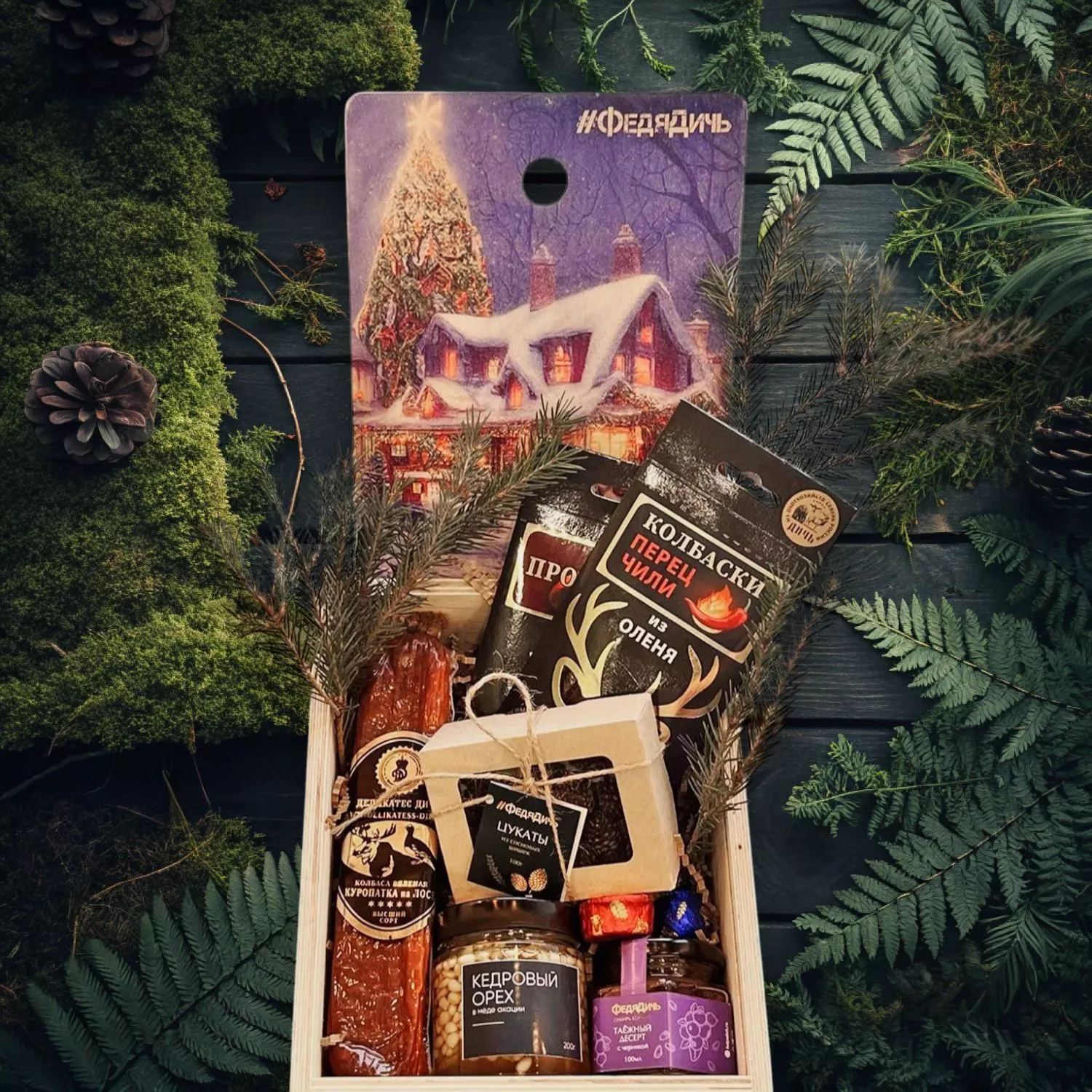 Колбаса "Куропатка на лосе" (из двух видов мяса), Таёжный десерт "Вяленая клюква и кедровый орех", Кедровый орех в мёде, Цукаты из сосновой шишки, Нарезка "Прошутто" из кабана, Колбаски из оленя "Перец чили", Конфеты в натуральном шоколаде "Ассорти"..