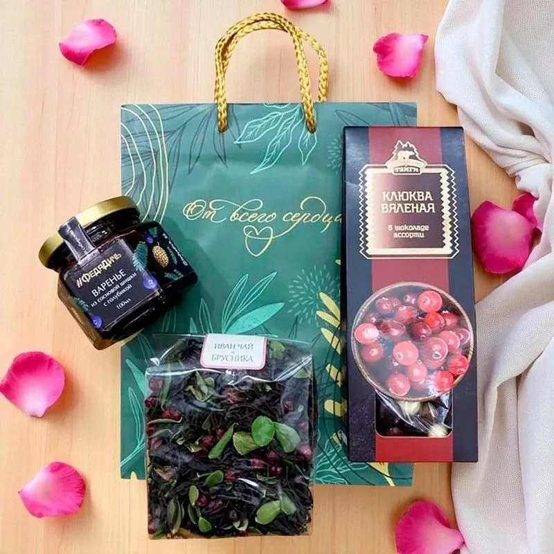 Варенье из сосновой шишки с голубикой, Вяленая клюква в шоколаде "Ассорти", Иван-чай с брусникой, Подарочный пакет.