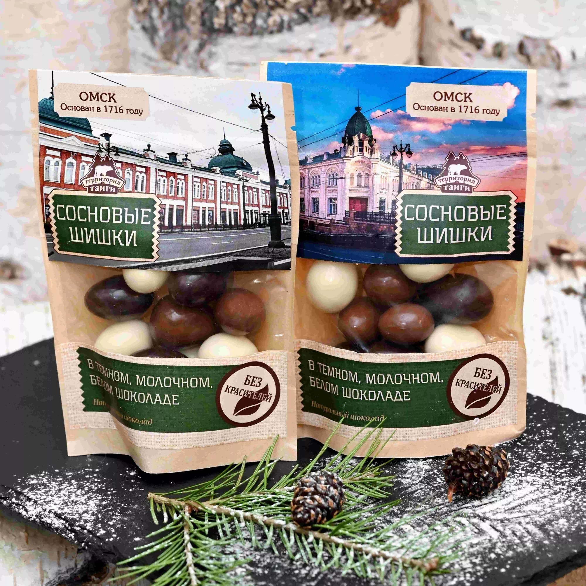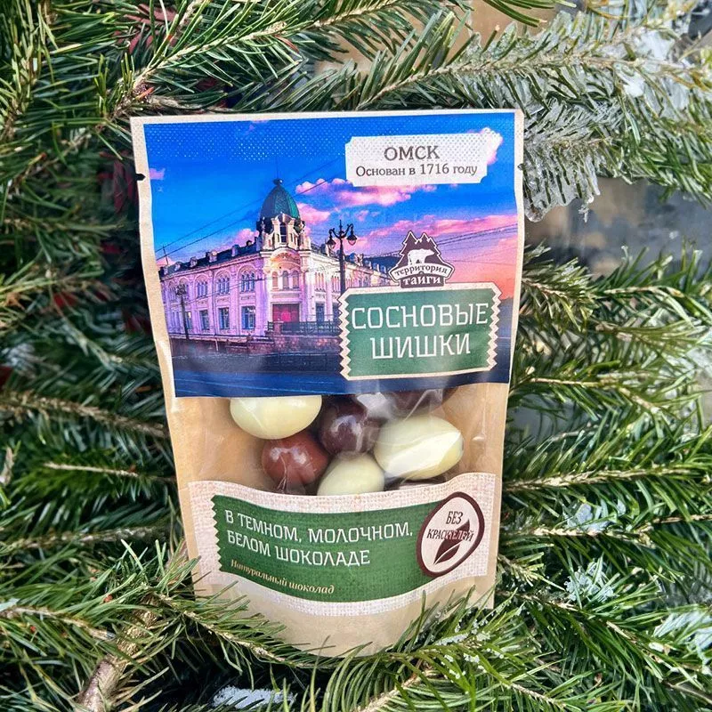 Молодые сосновые шишки, белый шоколад (сахар, масло какао, сухое цельное молоко, сухая молочная сыворотка, эмульгатор соевый лецитин, натуральный ароматизатор "Ваниль"), молочный шоколад (сахар, масло какао, сухое цельное молоко, какао тертое, эмульгатор соевый лецитин, натуральный ароматизатор "Ваниль"), темный шоколад (какао тертое, сахар, масло какао, эмульгатор соевый лецитин, натуральный ароматизатор "Ваниль"), сахар, глазирователь (натуральная пищевая добавка гуммиарабик, сироп глюкозы, растительное масло), глянцеватель (натуральная пищевая добавка шеллак, растительное масло).
