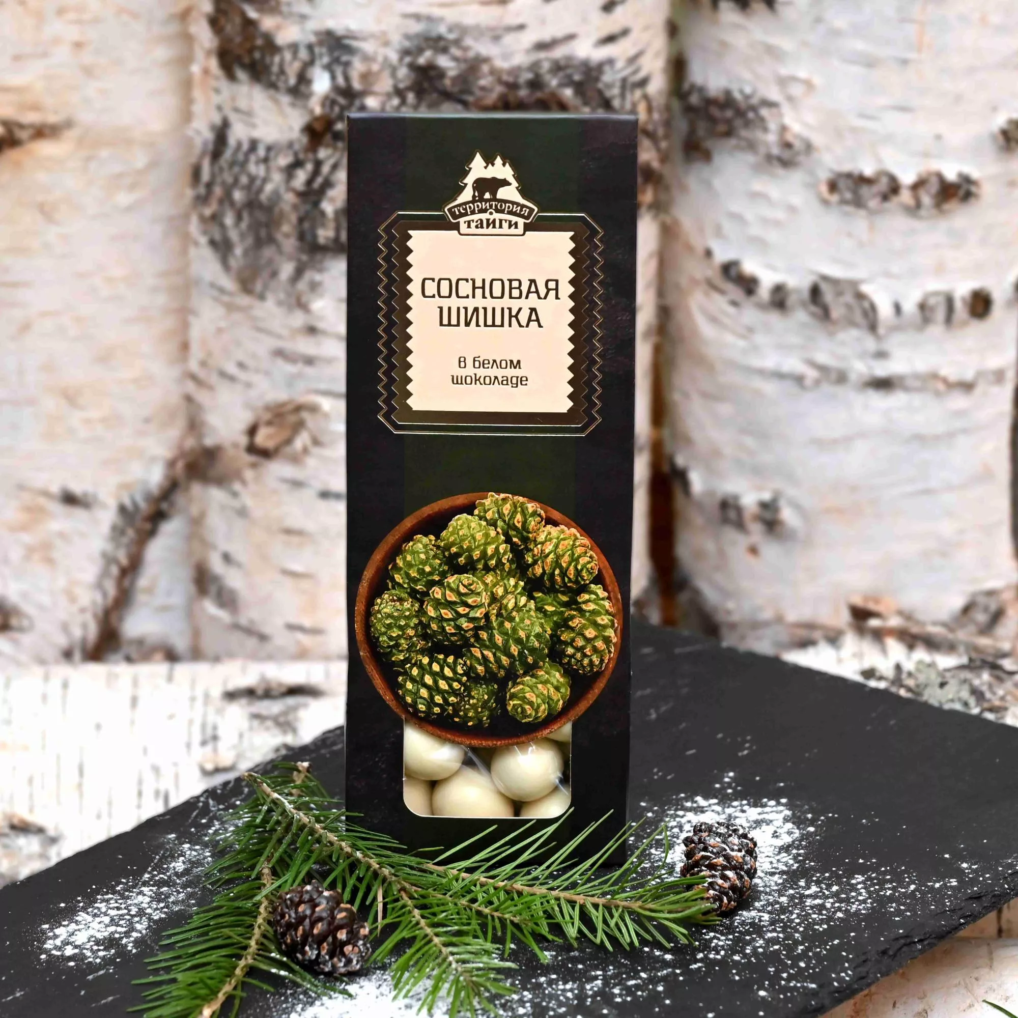 Попробуйте изысканное лакомство из Сибири! Корпус конфеты состоит из цельной молодой сосновой шишки, томленой до мармеладоподобного состояния, покрыт натуральным бельгийским шоколадом. Красивая упаковка делает наши конфеты прекрасным подарком по любому поводу.